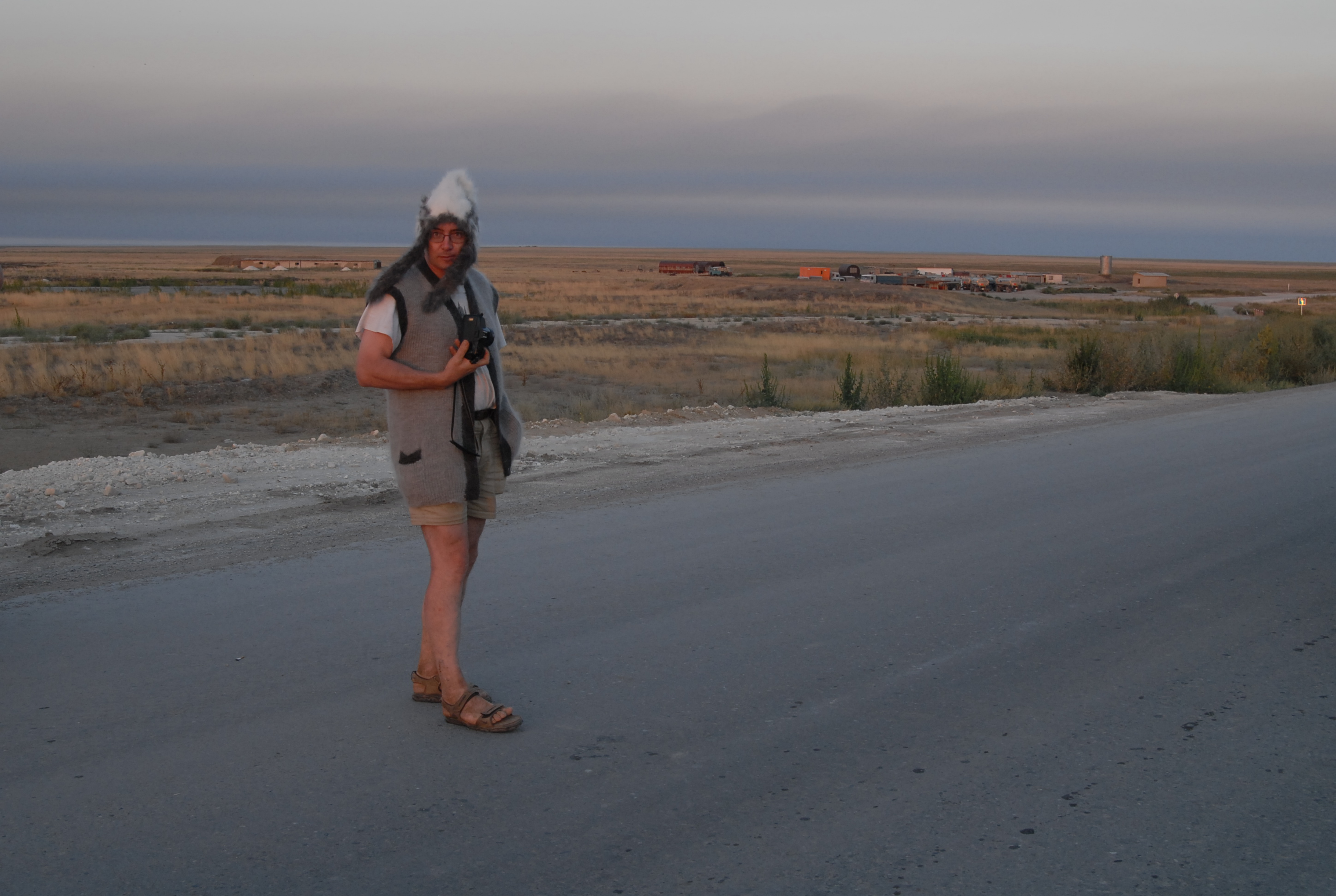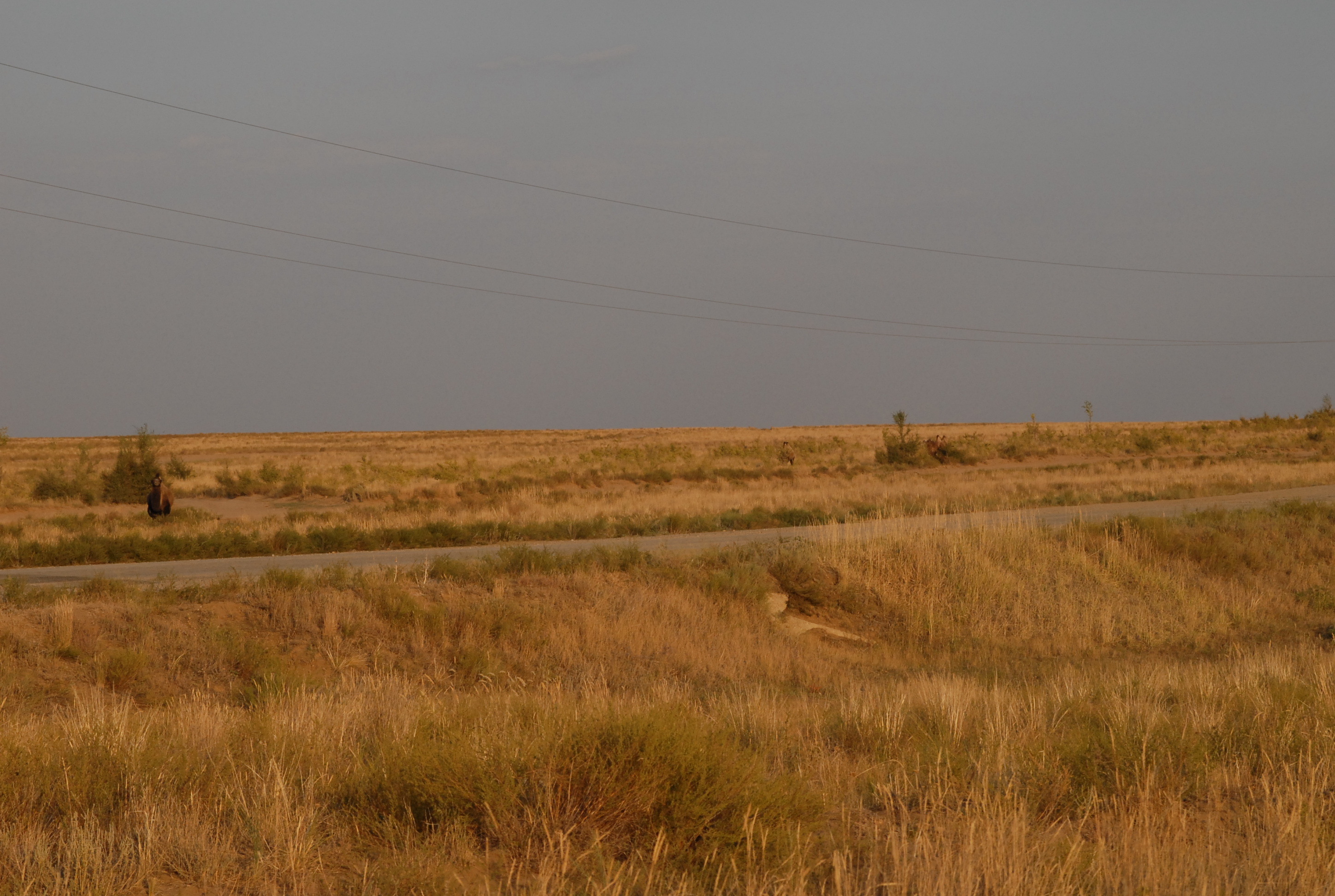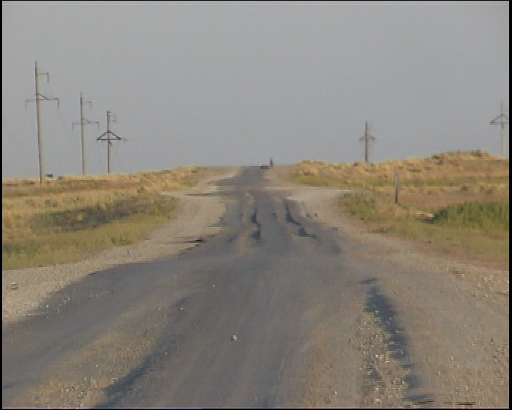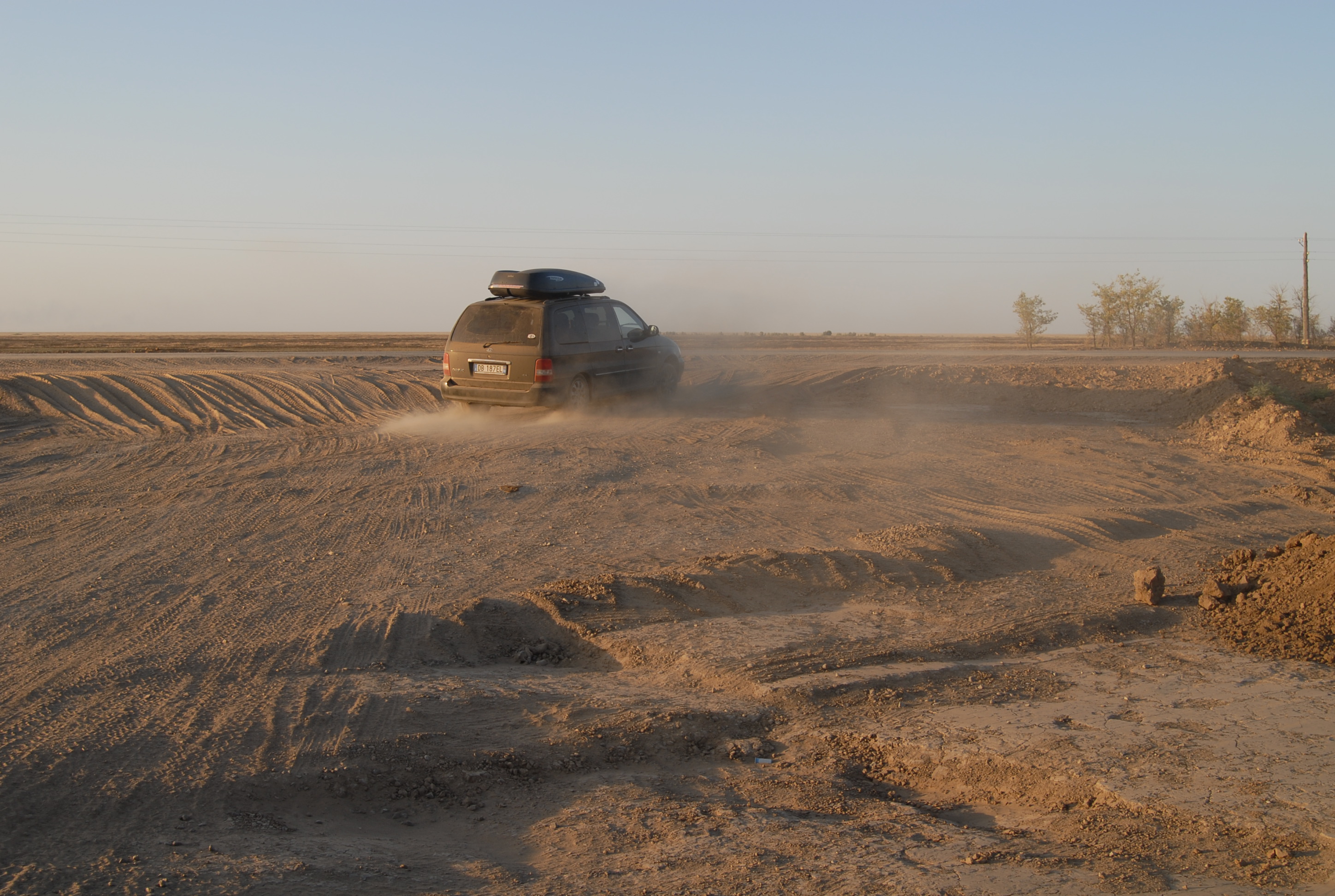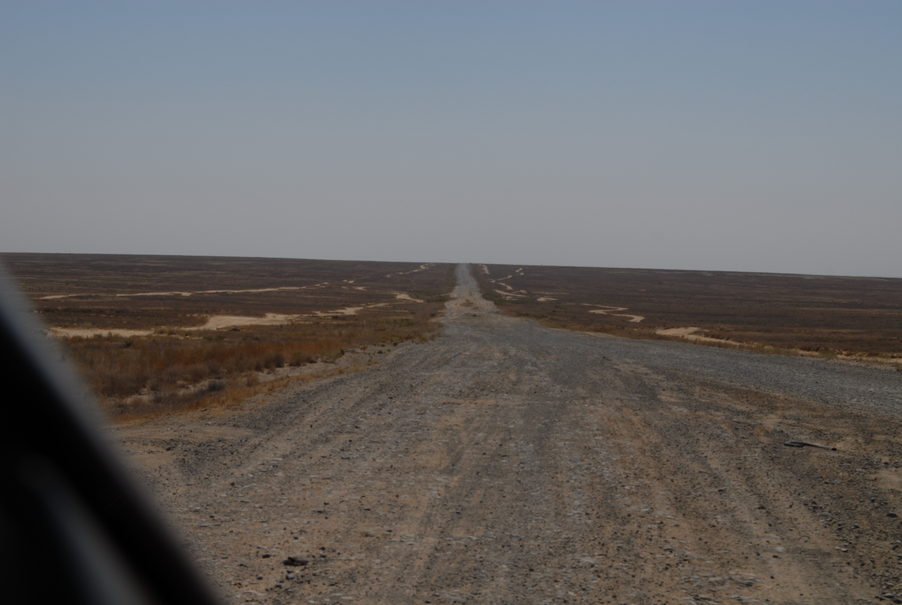 60 kilometri dopo Aktjubinsk ricomincia la solfa: due strade di sabbia con in mezzo una follia in asfalto... ma certo, con la luce, non è