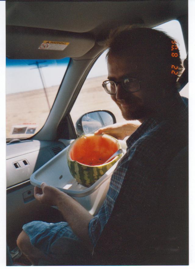 Michal mangia l'anguria. Una trentina di kilometri dopo raggiungiamo il mar d'Aral