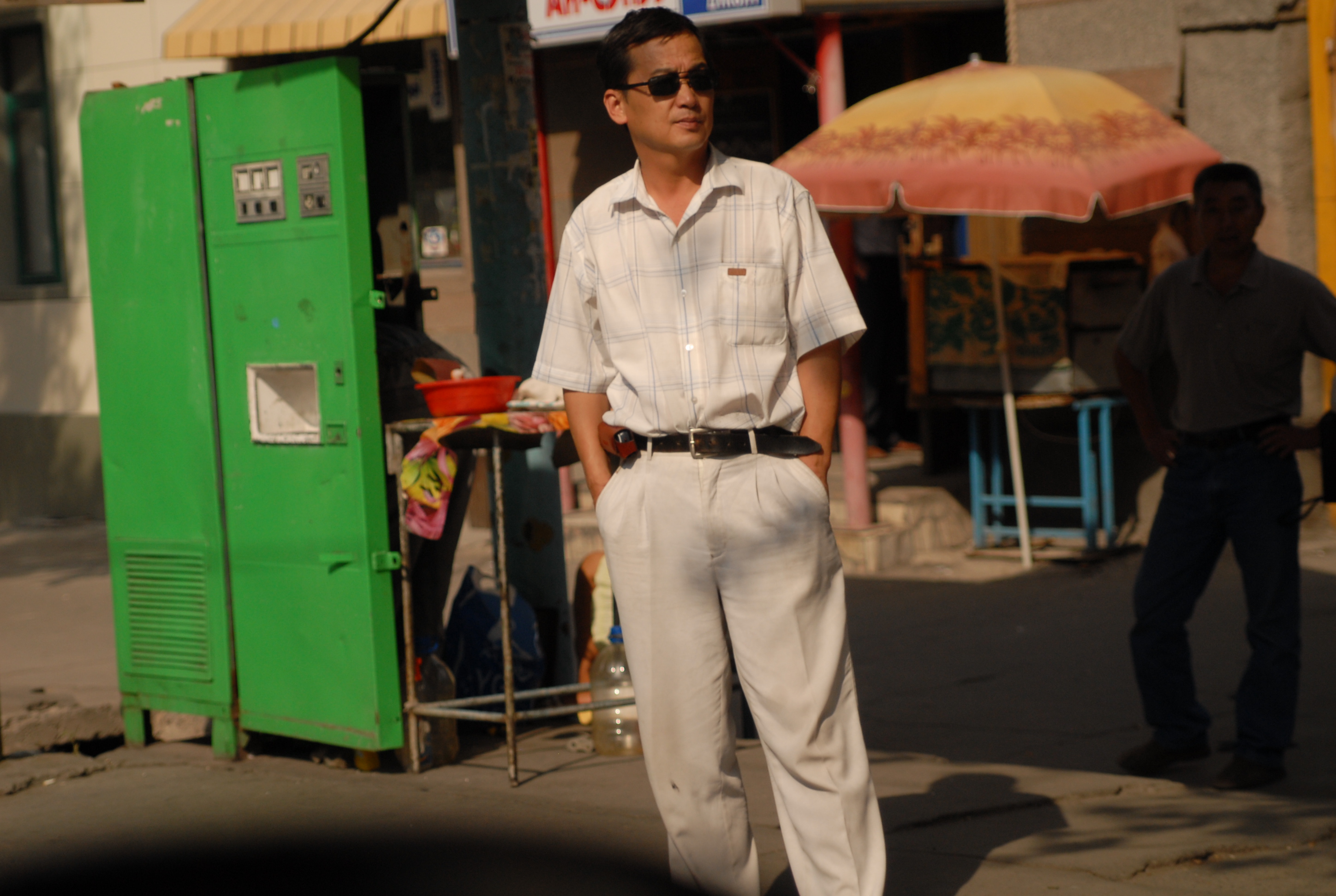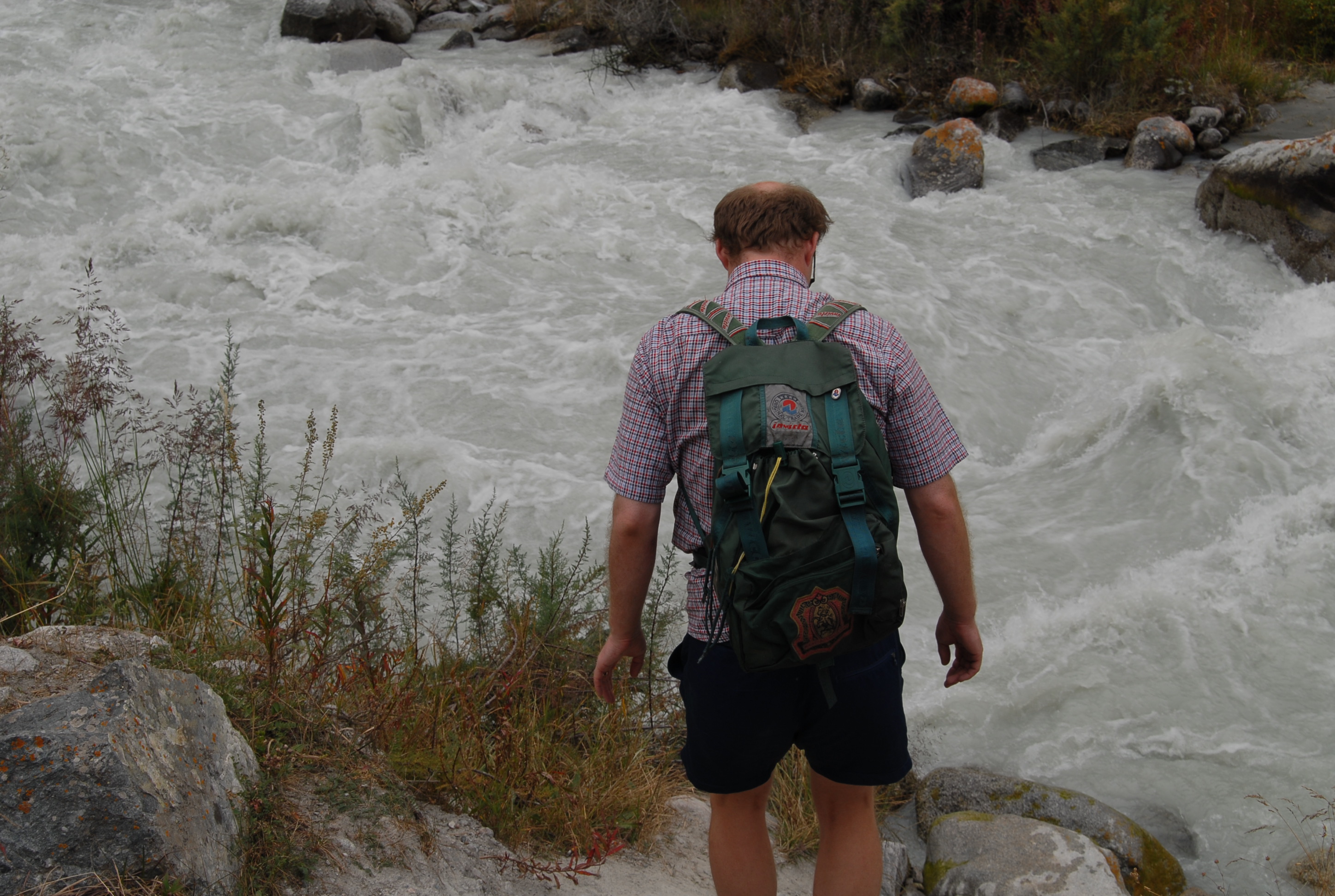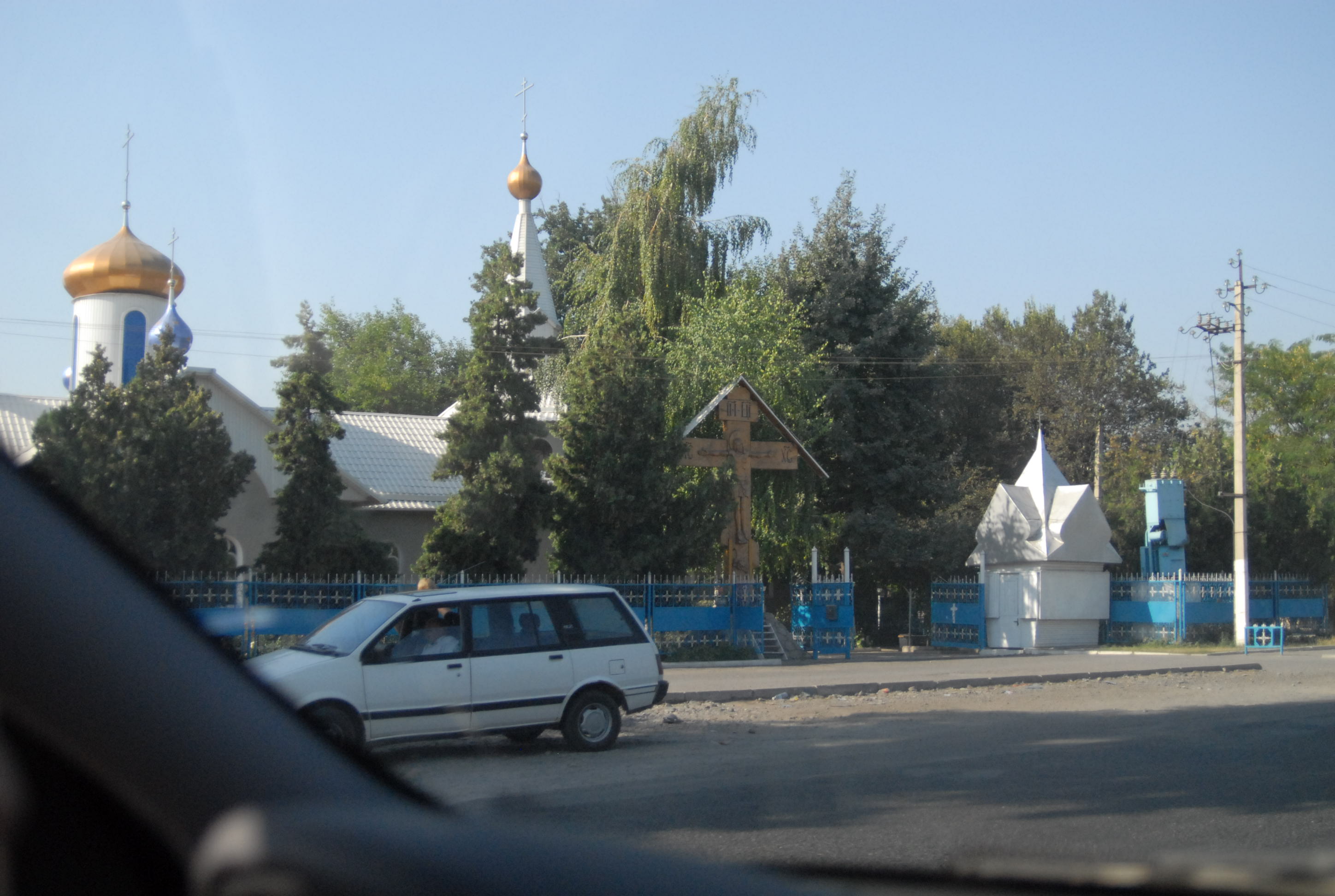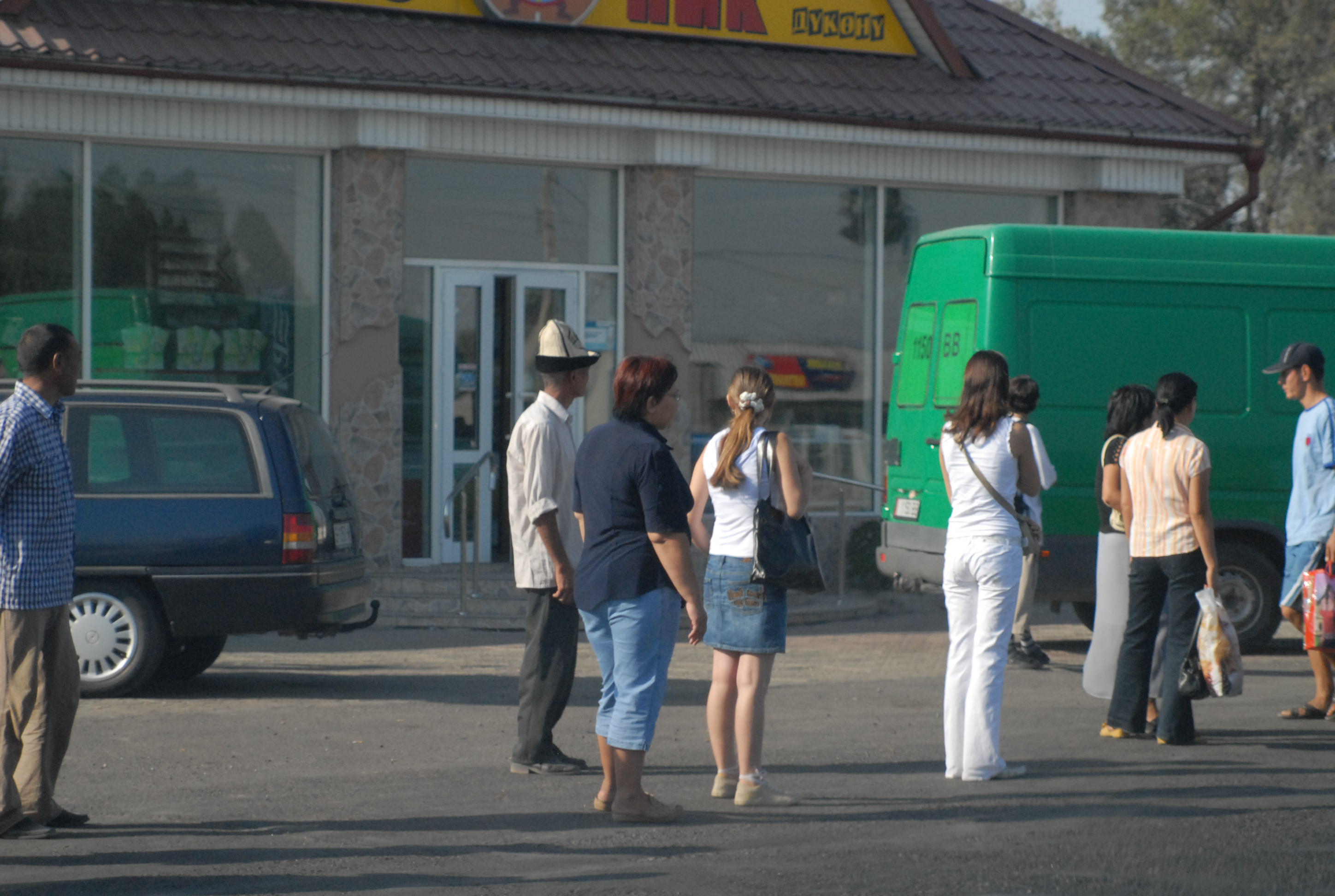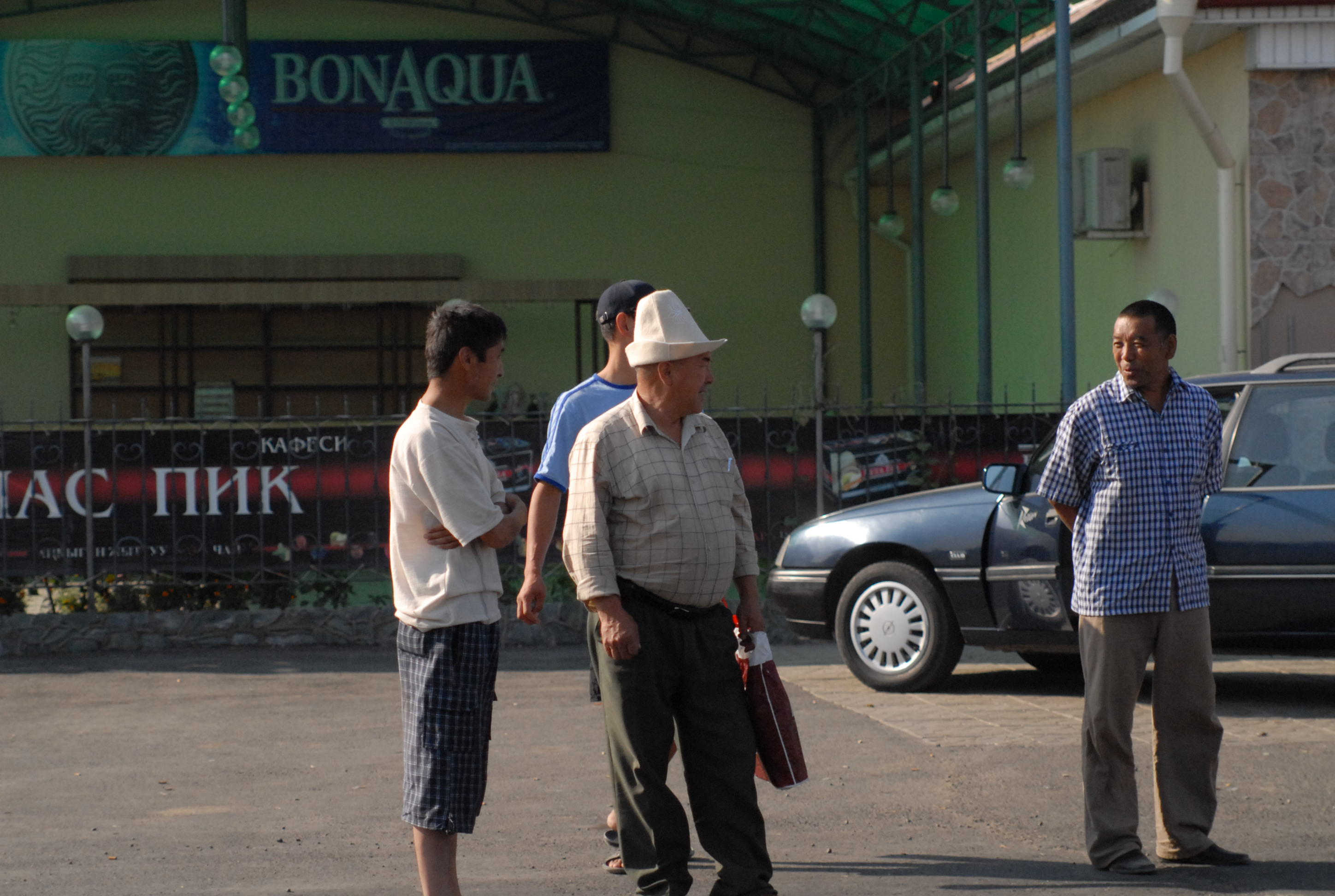 Non c'è più tempo di andare all'ambasciata e cerchiamo allora qualcuno che argini la crepa nel vetro della macchina. Lo troviamo, fa un bellissimo lavoro, con me trepidante per la paura che il vetro si rompa del tutto. Alle tre c'è il meeting, ma facciamo ancora a tempo ad andare a mangiare un hot-dog e a comprare souvenir kirgizi: le pantofole con la punta arrotondata, le magliette, un bel tappeto, e poi due splendide camice di seta. Davanti al supermercato incontriamo un ragazzo svizzero che chiede a Michal se parla inglese. Si scambiano impressioni e informazioni sulle strade. Lui è già venuto diverse volte in Kirgizstan, una volta in moto, ora no, sta aspettando un gruppo di tedeschi che accompagnerà a fare un tour in moto sulle montagne. Ci dà il suo biglietto da visita: Overcross, www.overcross.ch