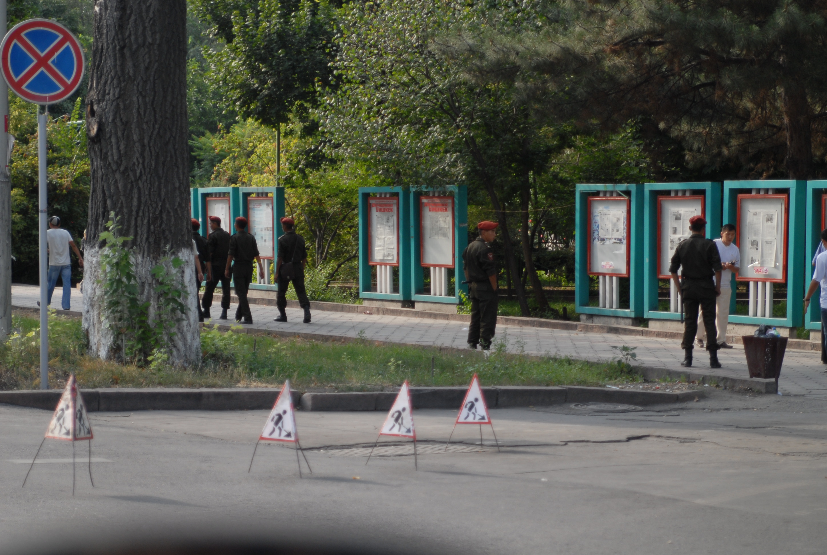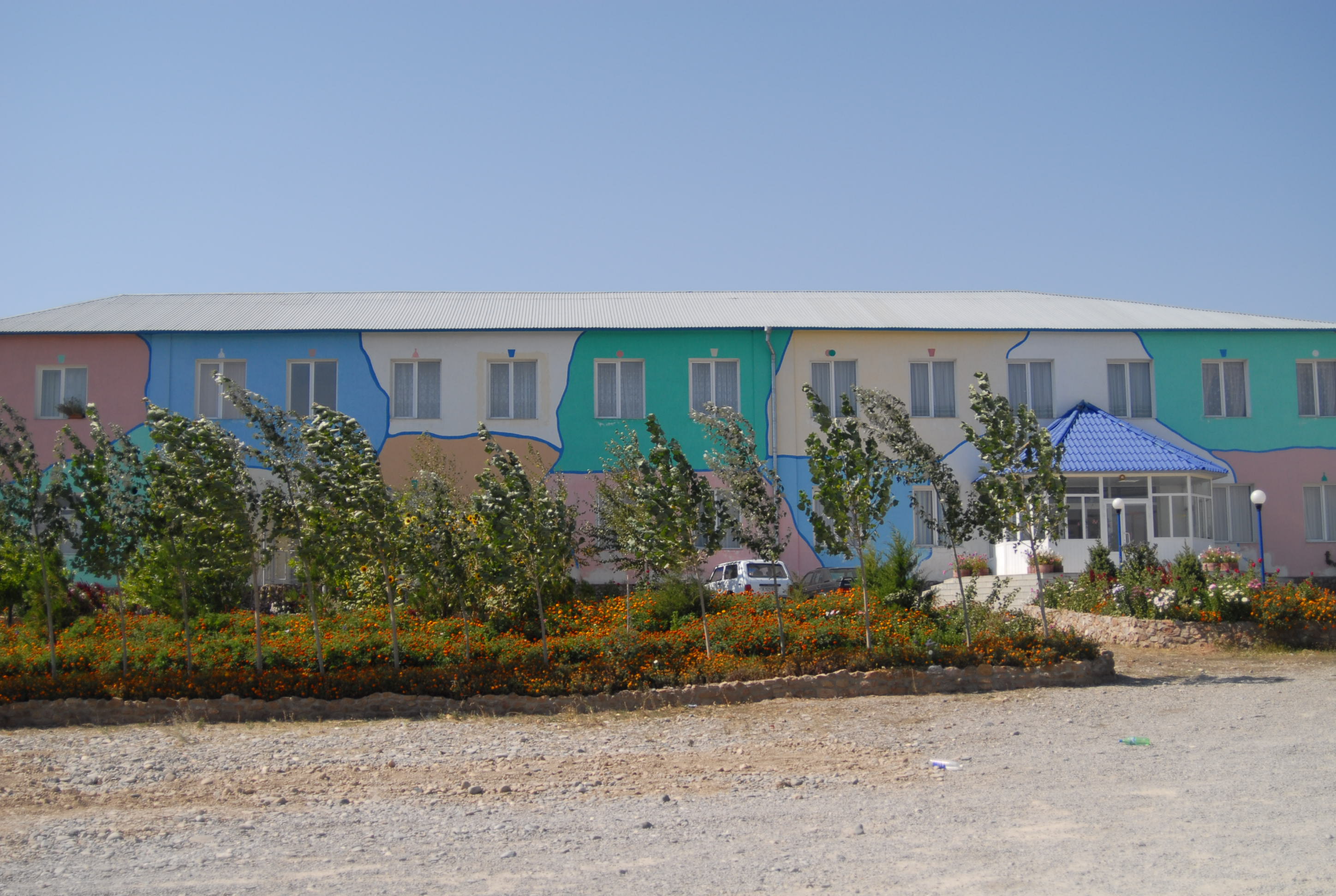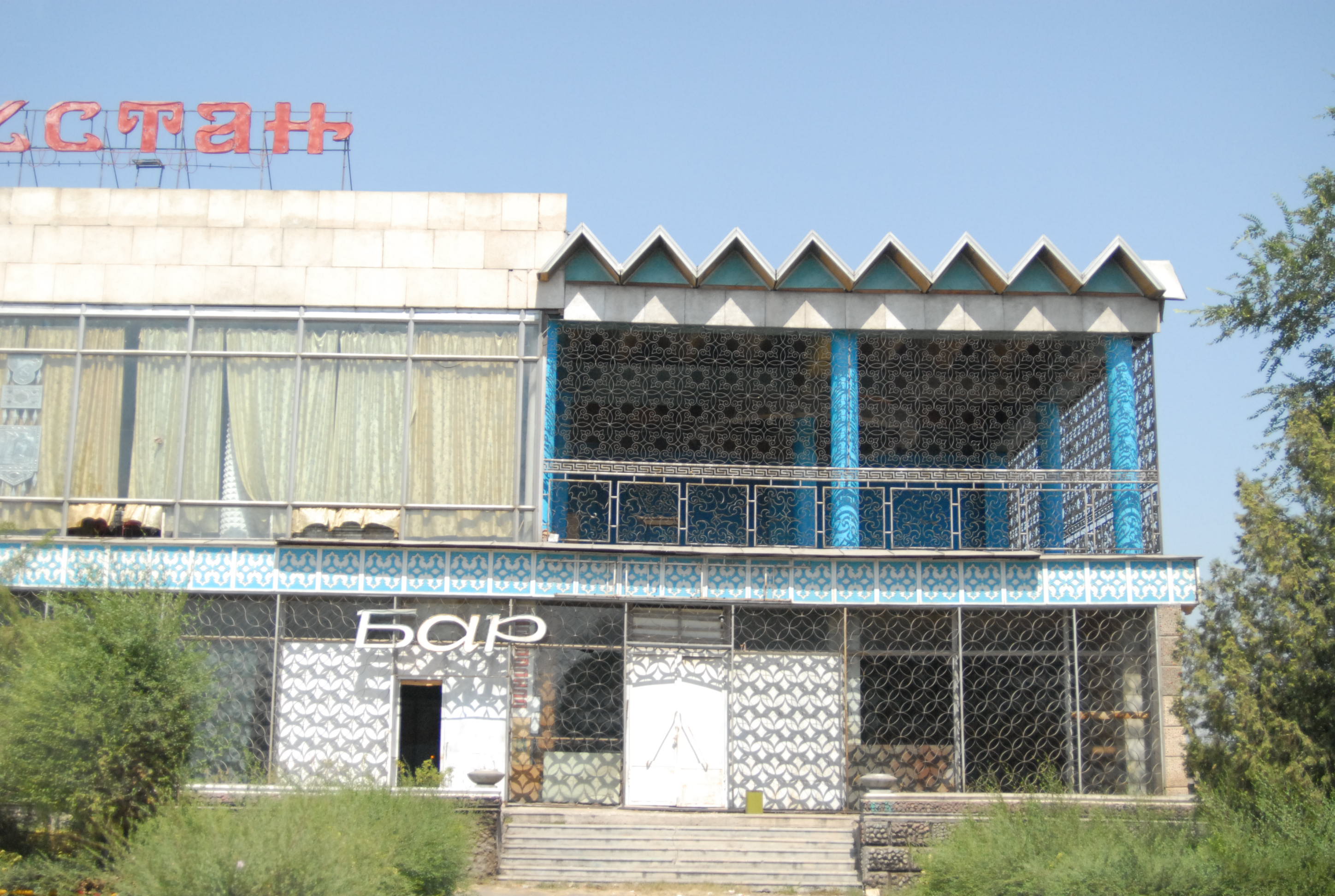 giovedì 24 agosto, Bishkek Per questo viaggio avevamo due visti russi, tre kazaki, uno kirgizo e uno uzbeko. In un primo tempo si pensava infatti di rientrare di nuovo dalla Russia, ma ora, sapendo che a Tashkent, alla fine dei meeting, saremo soli, con la libertà quindi di decidere il rientro, abbiamo deciso di evitare un ritorno già conosciuto, e di non usare il terzo visto kazako e il secondo russo, ma di farci fare ora i visti o per il Turkmenistan e l'iran o per il Turkmenista, l'azerbaijan e la Georgia. Questa mattina quindi avevamo previsto di andare all'ambasciata turkmena, però il nostro albergo fa così schifo, ma così schifo, che alle 7 del mattino siamo già lì che chiamiamo i due prima che venga loro in mente di andare a fare la doccia e con loro andiamo a cercarne un altro. Brave-heart è tutto contento che anche il lonely planet menzioni (come molto duro) l'albergo di questa notte. Dopo un sacco di giri, con prezzi superiori ai 20 euro, troviamo un hotel in una scuola. Anzi due. Ce n'è uno al terzo piano medio e uno al quarto piano bello. Noi optiamo per il medio naturalmente a metà del prezzo di quello del quarto piano. I due invece prendono la stanza sopra, per poi, il siciliano lamentarsi con Brave-heart che non valeva la pena..